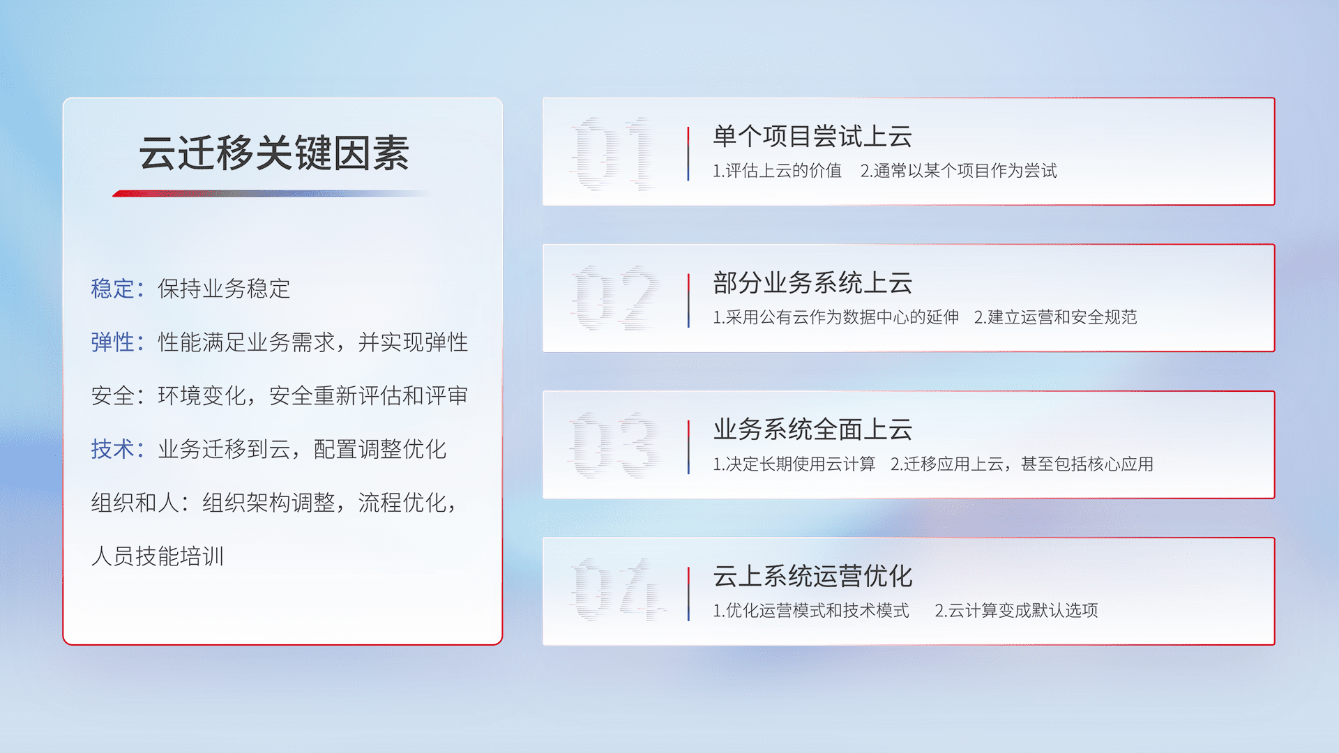 结合实际业务,,,从规划设计、、云平台选型、、、云原生改造、、、、数据迁移、、集成交付,,迁移全过程为客户识别最佳上云路径,,,做好风险识别管理,,设计网络架构、、、身份权限、、安全审计合规、、、、操作审计、、、日志审计、、、、监控告警策略、、、多站点容灾设计等,,,对云上基础设施进行整体规划,,,,提升IT治理水平,,,以满足弹性、、高可用、、高性能的需求。。