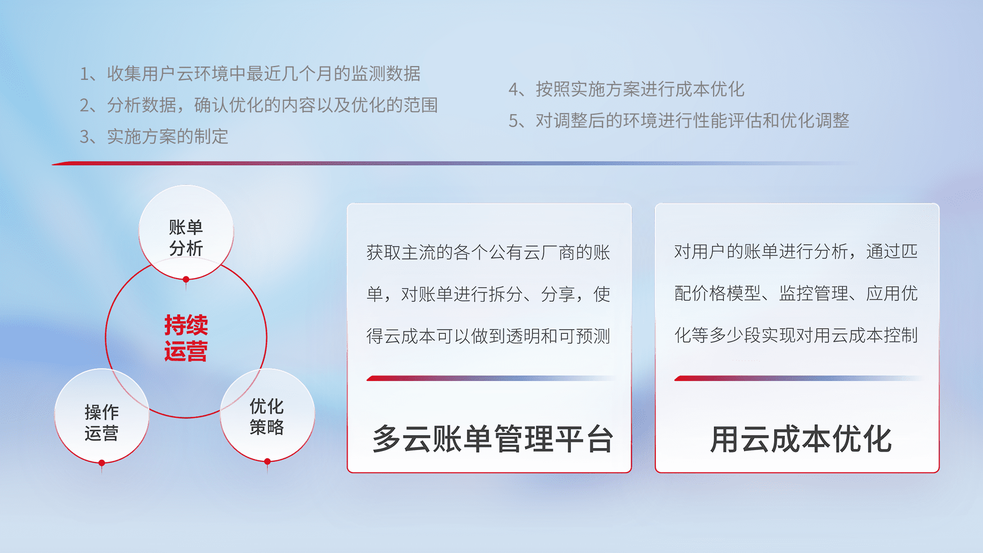 通过多云纳管,,以统一的资源数据模型把客户的云资源进行抽象和封装,,,,进而实现对多云资源的统一操作,,,保障云资源管理的可靠性、、稳定性与可用性。。。量身定制化运维内容,,配置、、、开发运维、、、、补丁管理、、、、备份、、、、监控、、认证和访问管理、、、、审计和日常巡检等,,,,保障在用云过程中的可靠度,,稳定度以及高可用率。。